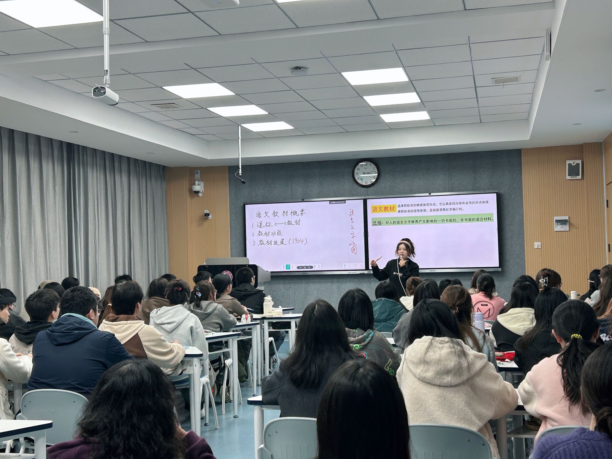 本次活动第一阶段的内容为课堂教学观摩。张格瑄老师主讲的语文学科教学论课程为公司课程思政示范课建设立项课程,张老师围绕语文教材概要这一章节内容在1205教室向听课教师进行了教学展示本节课教学目标明确,教学重点突出,师生互动融洽和谐,专业知识教学内容与思想政治教育相得益彰,既有知识深度、又有思想高度和情感温度,达到了预期效果。