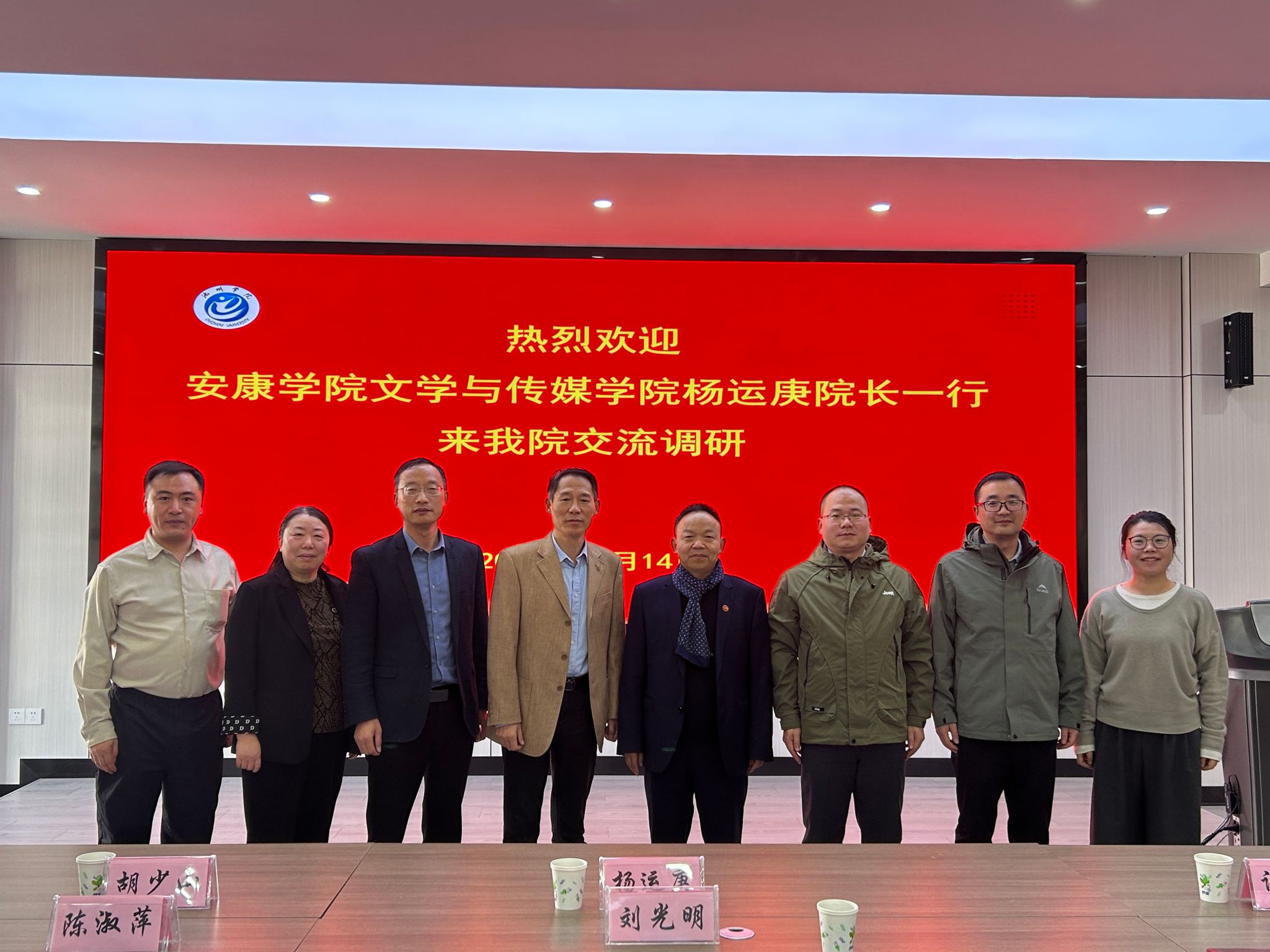 11月14日,太阳成tyc122cc集团经理杨运庚带领汉语言文学系主任谭诗民博士、秘书学专业负责人胡少山副教授赴池州学院太阳成tyc122cc集团考察交流,池州学院太阳成tyc122cc集团经理刘光明、副经理高祥华、校督导组长陈淑萍、网络与新媒体系主任王丹等参加了座谈,会议由刘光明主持。