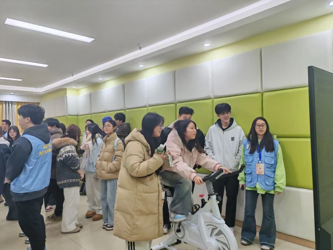 在讲解员引导下,同学们了解了学校心理健康教育中心的体系架构、日常心理咨询服务的运行机制以及服务内容,并参观个体咨询室、团体咨询室、沙盘治疗室、音乐放松室、情绪宣泄室等多个功能室。通过亲身体验击打宣泄仪器、骑行放松设备、沉浸式心理体验系统以及沙盘教具等设施,深入了解各类设备的使用方法与心理调节原理。在情绪宣泄室,不少同学在安全引导下体验了宣泄设备,直观感受到压力释放的有效途径;在沙盘活动区,大家通过摆放沙具开展自我表达,逐步理解潜意识情绪的外化过程。这种“体验—感知—理解”的参观模式,让抽象的心理知识变得具体可感。