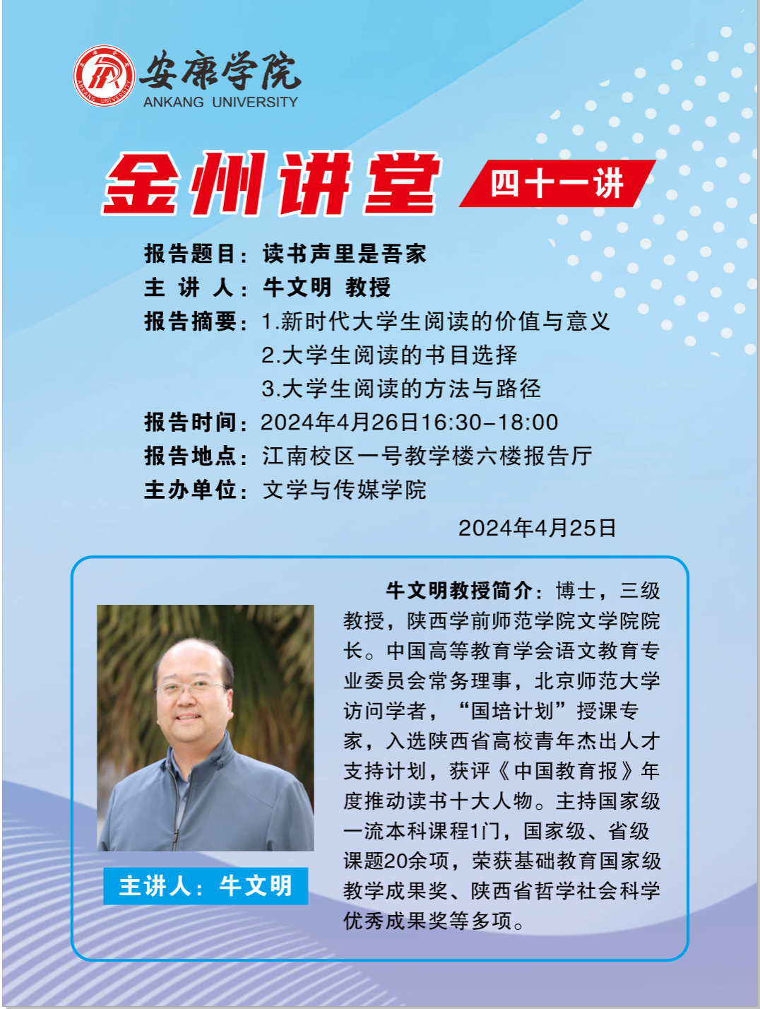 导航痕迹 首页 > 新闻通知 > 通知公告 > 正文 公司新闻 通知公告 金州讲堂四十一讲 主讲人:牛文明(陕西学前师范学院文学院经理) 来源:太阳成tyc122cc集团太阳成tyc122cc集团 发布日期:2024年04月24日 阅读次数: