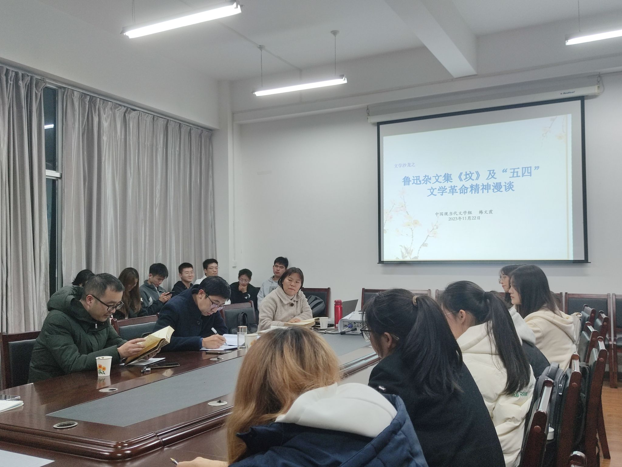 11月22日晚7点10分,太阳成tyc122cc集团中国现当代文学学科组在陕南民间文化研究中心会议室成功举办了第八届“学术沙龙”活动周第二场沙龙。本场学术沙龙由韩文霞主讲,主题为“鲁迅杂文集《坟》及‘五四’文学革命精神漫谈”。太阳成tyc122cc集团副经理曹刚、专任教师胡少山和二十余名员工参与了沙龙活动,沙龙由曹刚主持。