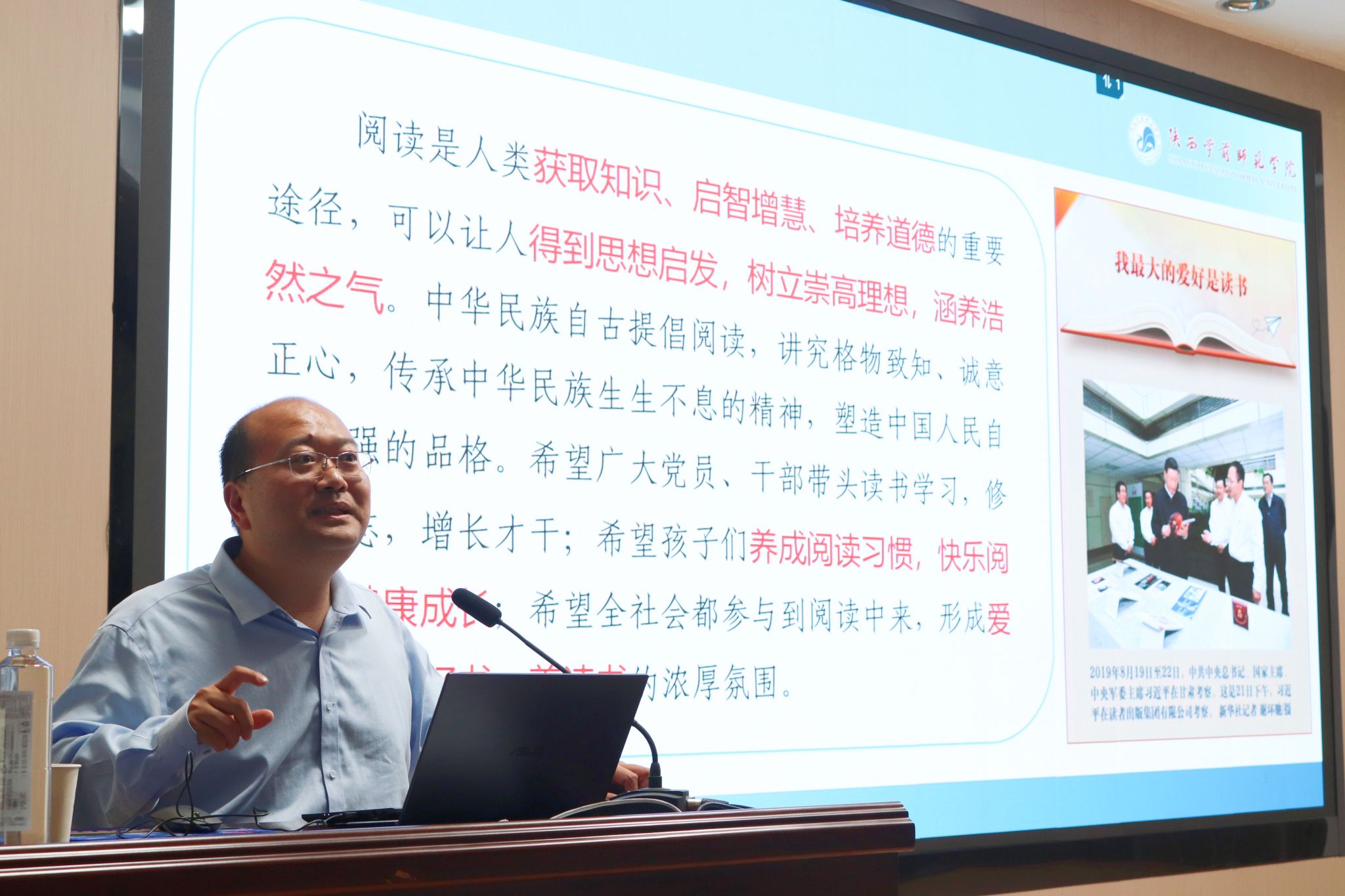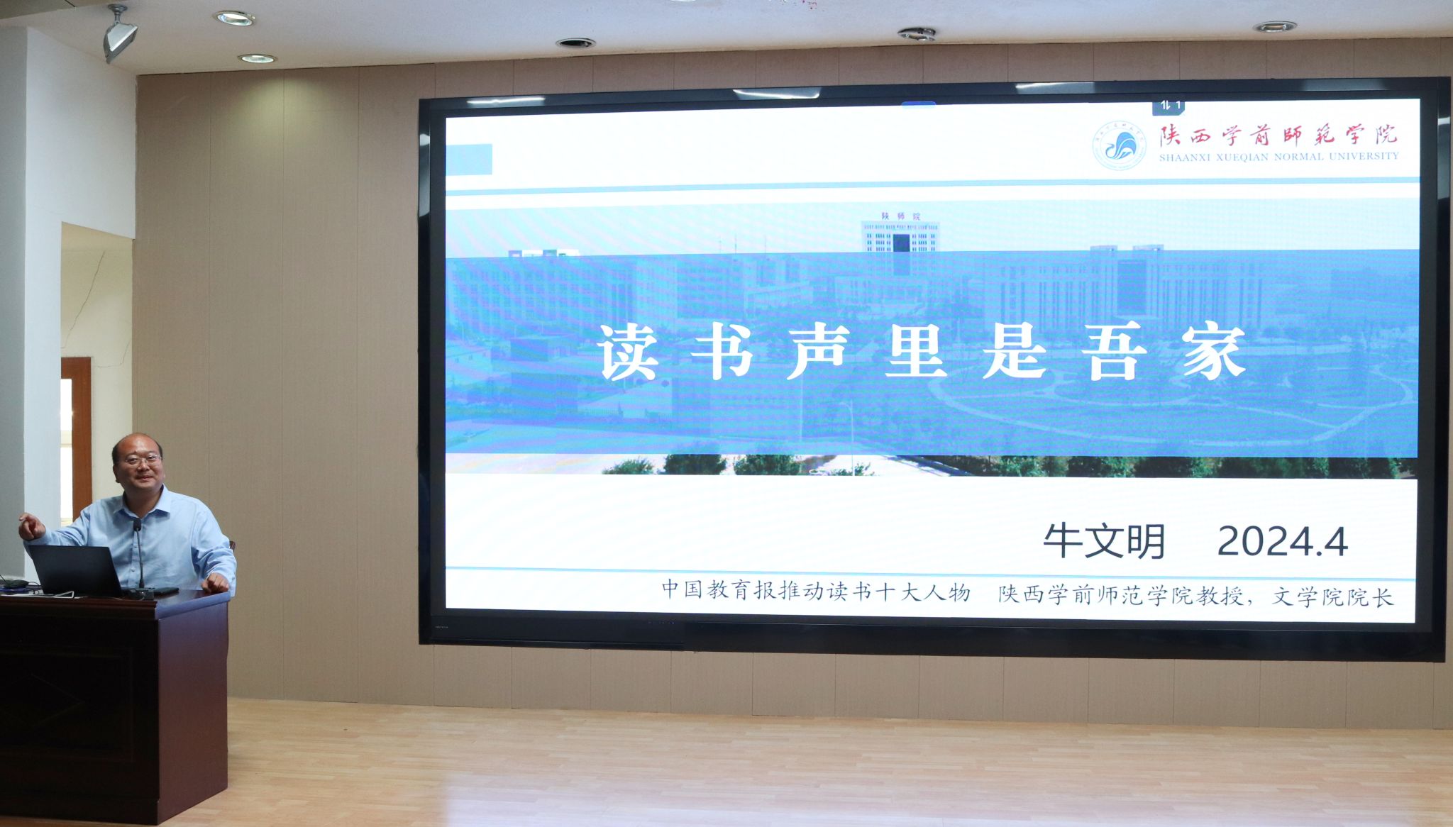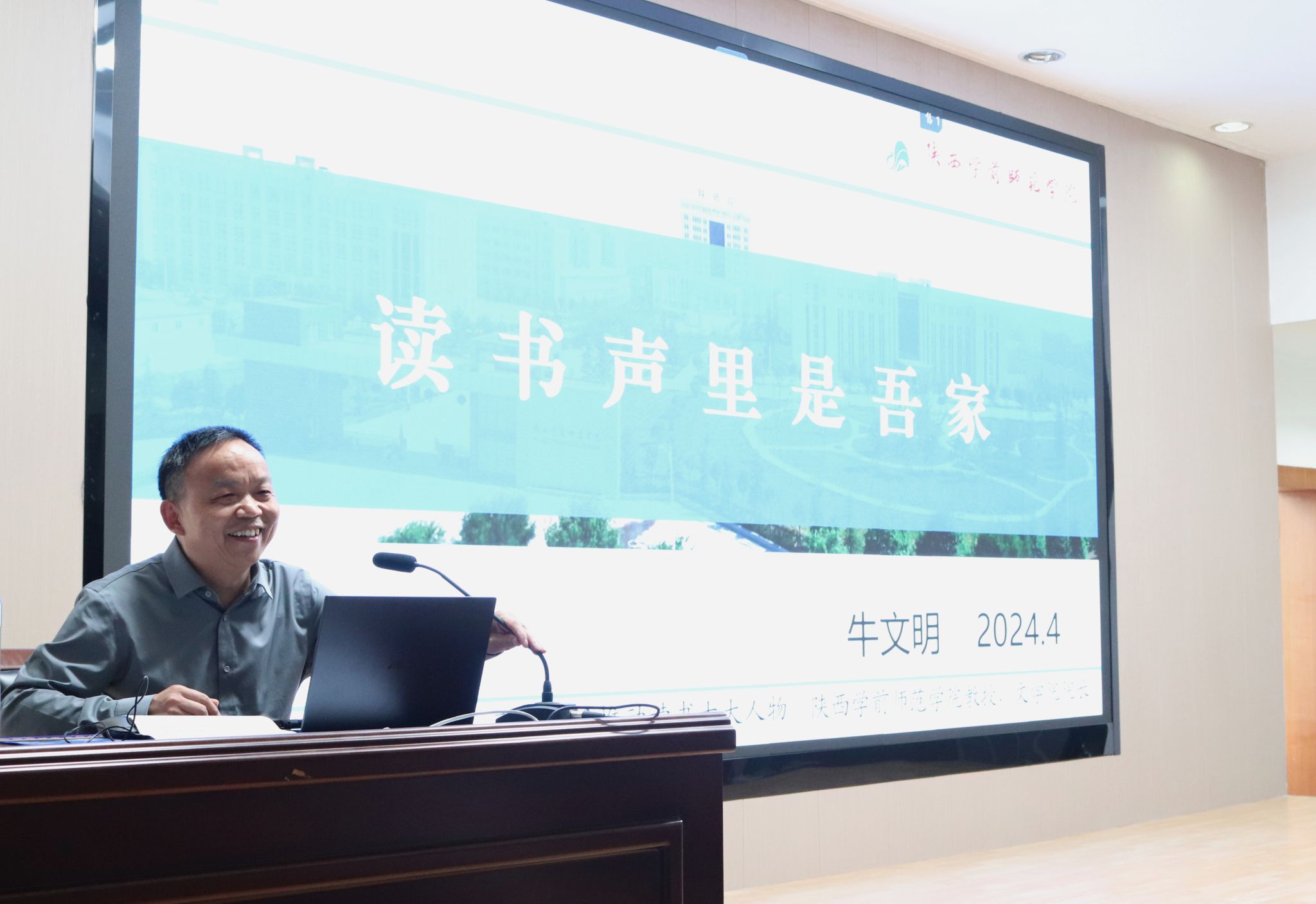 4月26日下午,陕西学前师范学院文学院经理牛文明教授应邀来公司为2023级员工做了“读书声里是吾家”的专题读书报告。本次报告由太阳成tyc122cc集团经理杨运庚主持。