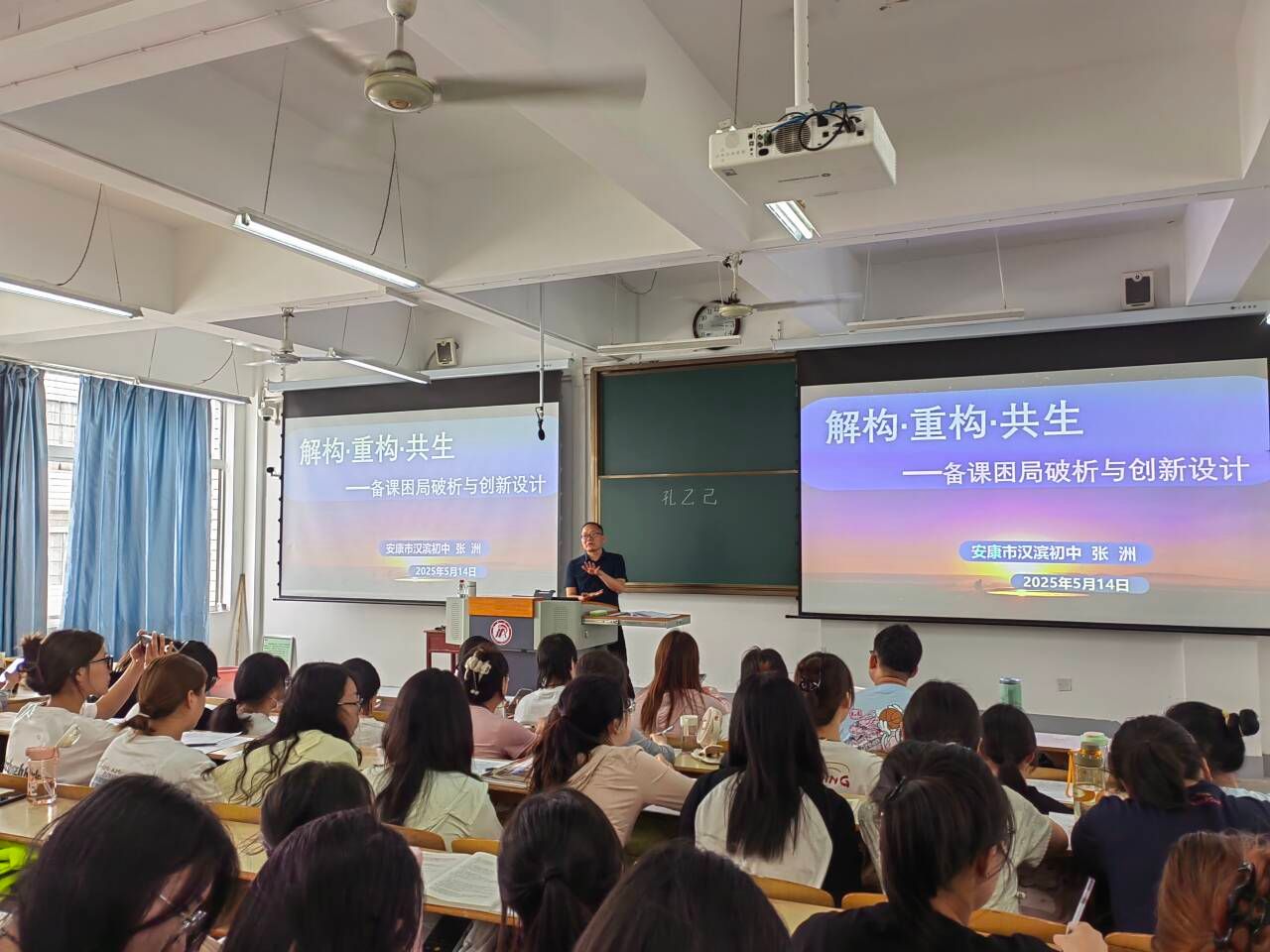 2025年5月14日下午,太阳成tyc122cc集团在江南校区1510教室举办《孔乙己》示范课展示及解构·重构·共生——备课困局破析与创新设计专题讲座活动。本次活动特邀陕西省教学能手、汉滨初级中学张洲老师主讲,班主任唐明珍和第四届中学语文卓越团队班全体学员及部分毕业生共同参与。