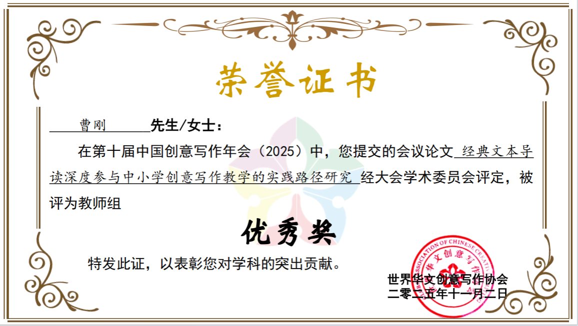 公司高度重视此次学术交流契机,积极组织团队参与。写作方向教师曹刚副教授、胡少山副教授受邀出席本次年会,并在分会场围绕创意写作团队建设、教学实践创新等议题进行专题发言,分享公司在创意写作领域的办学经验与探索成果,得到与会同仁的好评。曹刚副教授提交的学术论文《经典文本导读深度参与中小学创意写作的实践路径研究》,荣获教师组优秀论文奖。