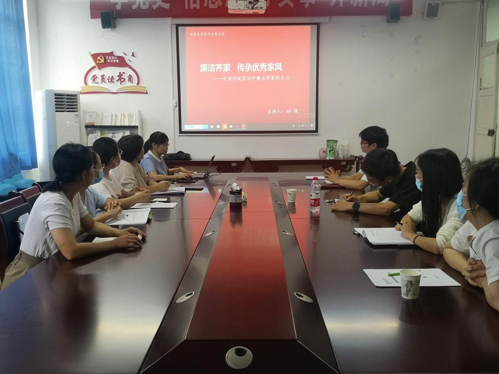 导航痕迹 首页 > 标杆党总支 > 党建+X > 正文 标杆党总支 总支概况 制度建设 学习计划 党建工作总结 党建+X 成果展示 样板党支部 太阳成tyc122cc集团教工第一支部开展“廉洁齐家,传承优秀家风”主题党日活动 来源:太阳成tyc122cc集团太阳成tyc122cc集团 发布日期:2022年09月13日 阅读次数: 9月7日下午,太阳成tyc122cc集团教工第一党支部开展了“廉洁齐家,传承优秀家风”主题党日活动,活动在2307会议室举行,由支部书记韩文霞主持,支部全体成员参加学习。 此次会议邀请孙鸿教授为我支部做“廉洁齐家,传承优秀家风”主题讲座。孙教授从中国传统家庭教育开始讲解,介绍了中国传统家庭教育的目的、方法,中国传统家训的主要内容及对当代廉洁齐家的启示,最后孙教授指出,廉洁是共产党人的基本底线,党员同志要以“家廉”促“党廉”,净化党内政治生态;以“家廉”促“社廉”,促进社会风清气正。 活动结束后,教师党员们纷纷表示,通过孙教授的此次分享,学习收获良多。家风建设关系着社风、民风、国风,是促进社会和谐、民族进步、国家发展的重要精神动力。党员同志要遵纪守法、廉洁从政、修身齐家,以自身行动带动和引导家人亲属营造风清气正、祥和安乐的家庭氛围。 撰稿/曹璇璇 审核/韩文霞 摄影/发布/崔瑜
