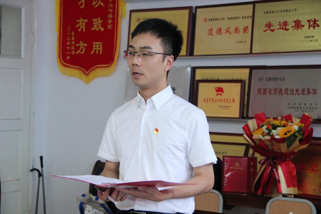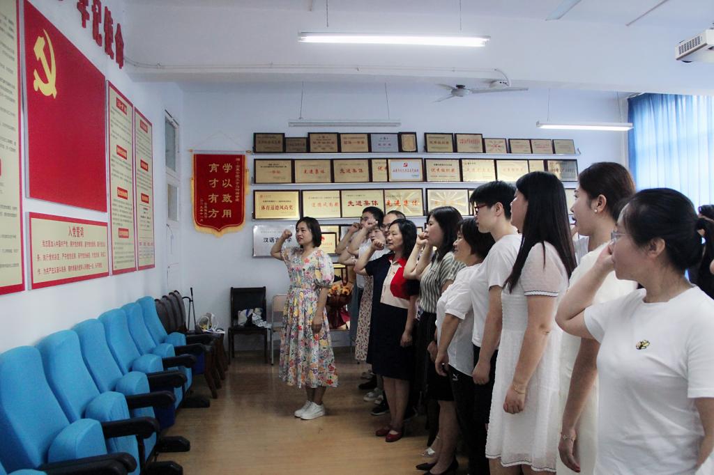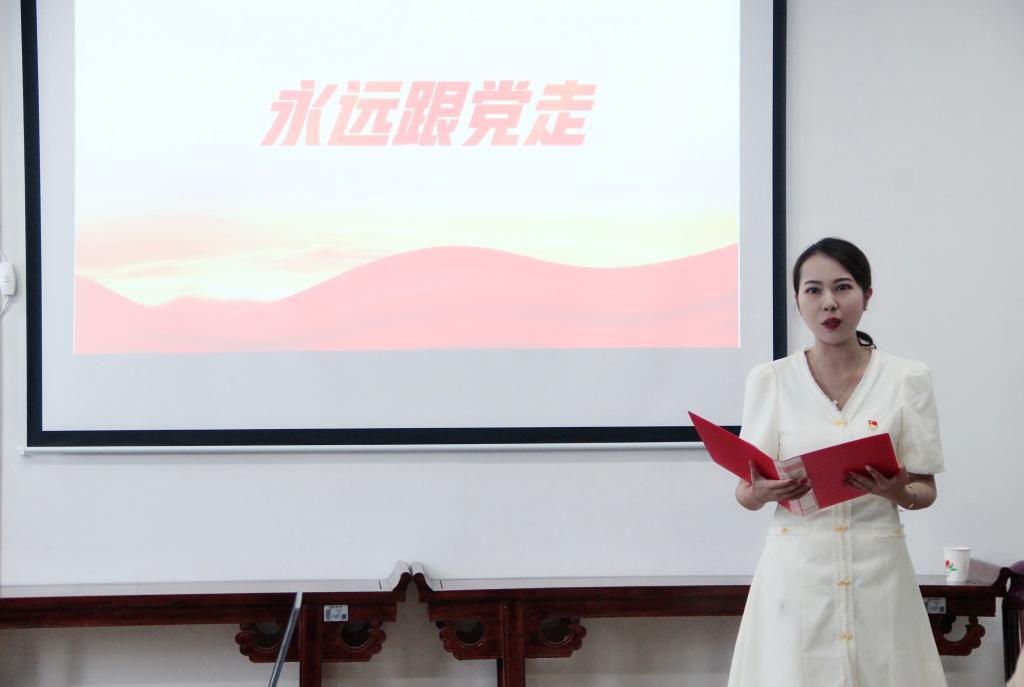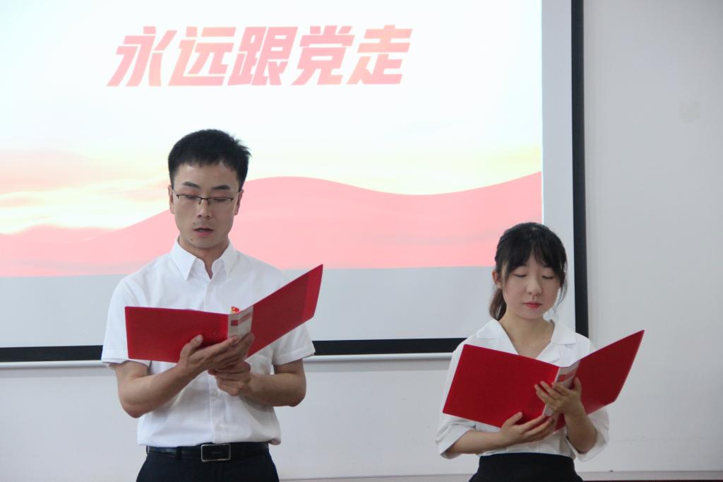 “我志愿加入中国共产党,拥护党的纲领,遵守党的章程……”面对鲜红的党旗,全体党员在​太阳成tyc122cc集团副经理李婷的带领下,重温入党誓词,用铿锵有力的声音再次向党作出庄严承诺。随后,来自教工一支部的青年党员黄治强,谭志轩与教工二支部青年党员盘珊君分别带来诗朗诵《永远跟党走》《大写的中国》,用生动的语言、真挚的情感,弘扬伟大建党精神、礼赞时代新成就。