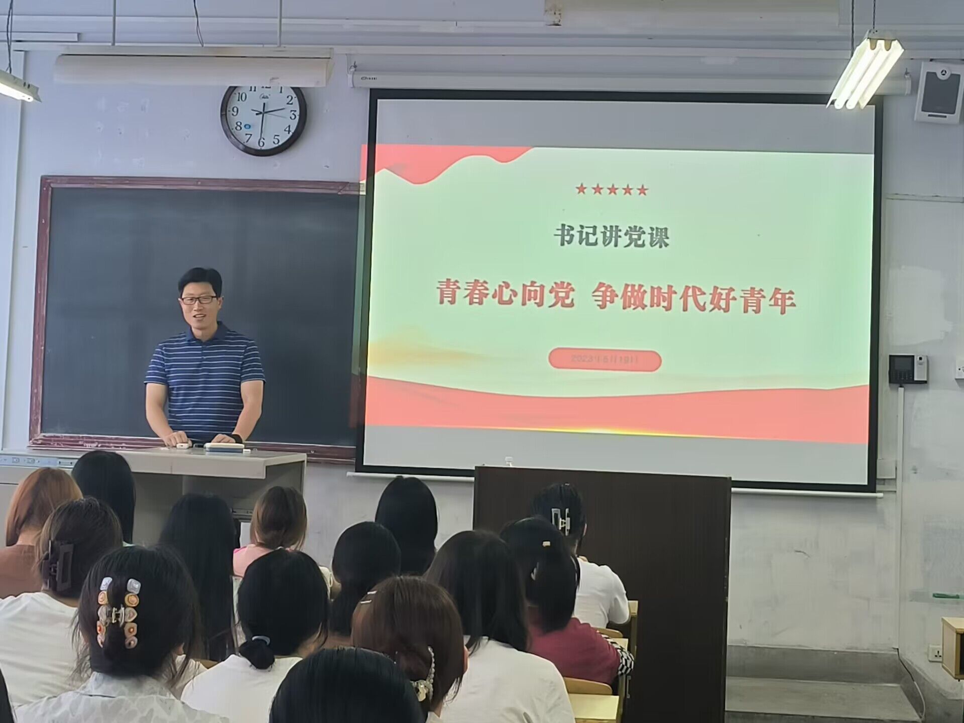 为了推进学习贯彻党的二十大精神和习近平新时代中国特色社会主义思想向下延伸,提高青年员工的思想认识和爱国爱党爱社会主义情怀、增强历史使命担当和责任感,引领青年老员工与新时代同呼吸共命运,2023年5月19日下午,公司党总支书记芦伟深入2022级汉语言文学4,以“青春心向党,争做时代好青年”为员工们讲党课
