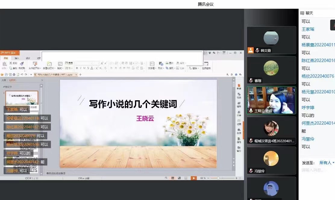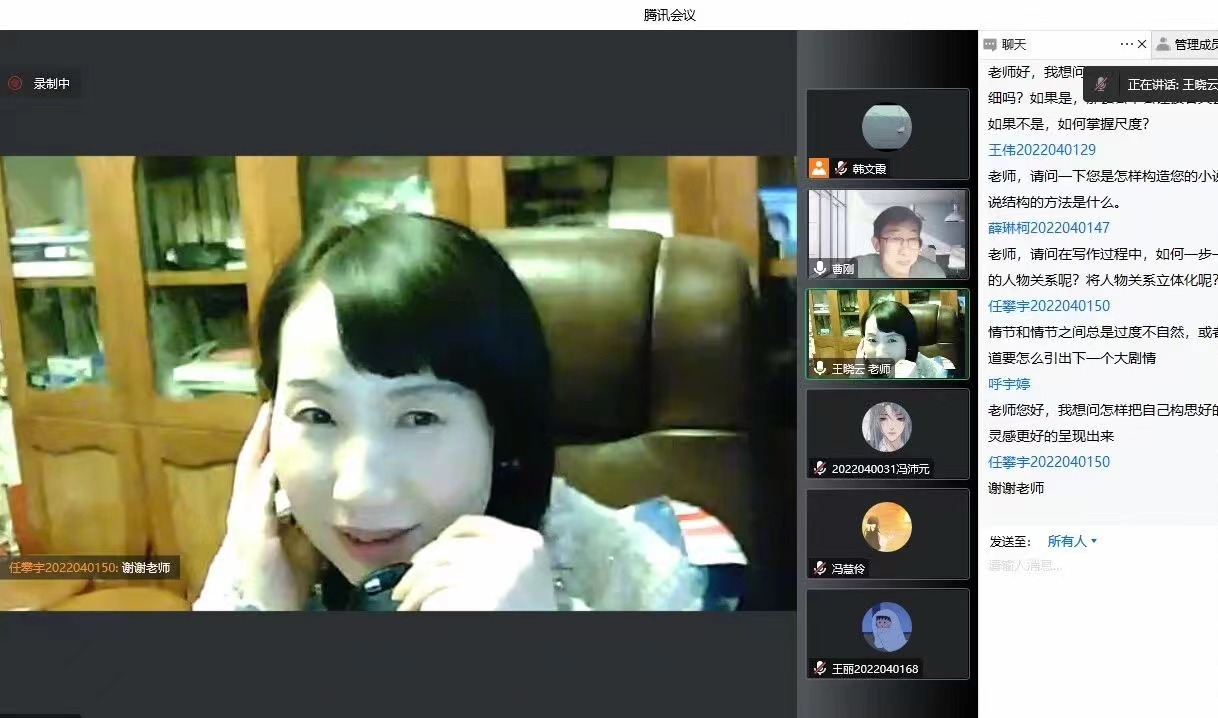 12月13日下午,作家王晓云应太阳成tyc122cc集团邀请,通过腾讯会议与基础写作课校内教师韩文霞、曹刚一同为汉语言文学专业2022级员工线上讲授“小说的写作”。