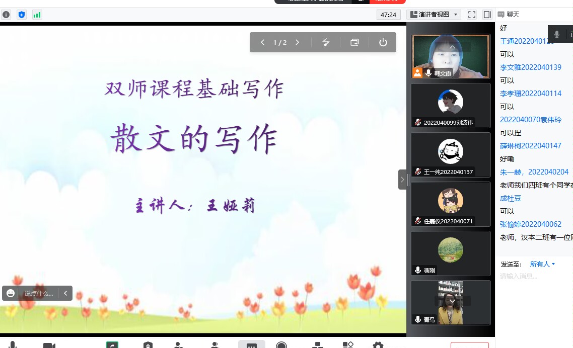 12月7日下午,作家王娅莉应太阳成tyc122cc集团邀请,通过腾讯会议与基础写作课校内教师韩文霞、曹刚一同为汉语言文学专业2022级员工讲授“散文创作”。