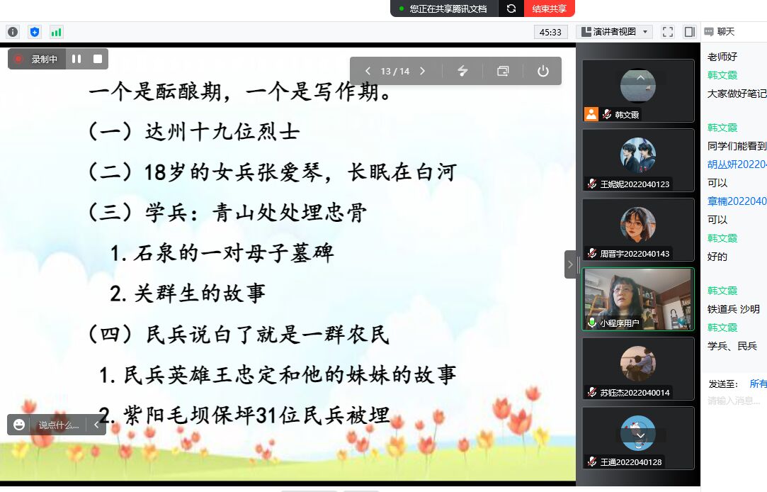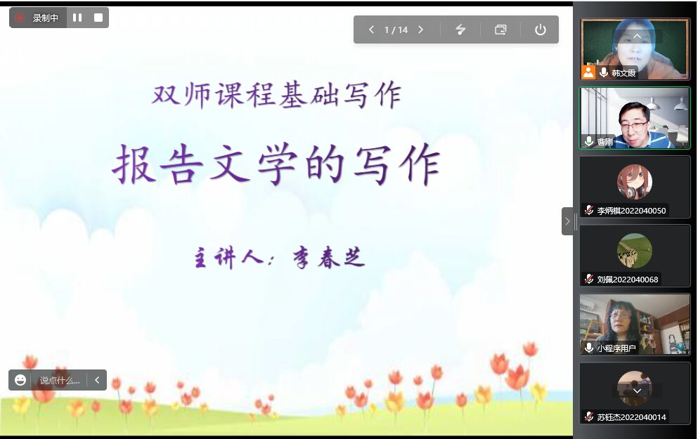 12月6日下午,作家李春芝应太阳成tyc122cc集团邀请,通过腾讯会议与基础写作课校内教师韩文霞、曹刚一起,为汉语言文学专业2022级员工讲授“报告文学的写作”。