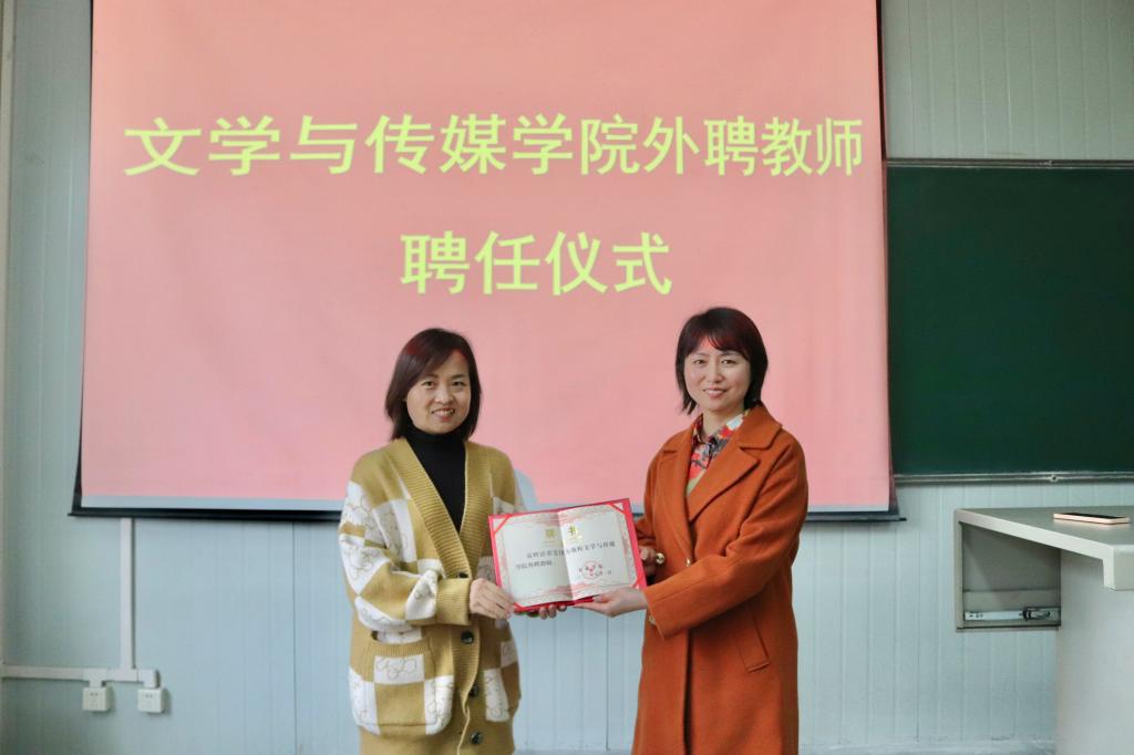 聘任仪式上,学院副经理李婷为董雯汶老师颁发外聘教师证书,并对董老师支持和帮助汉语言文学专业人才培养工作表示由衷感谢。