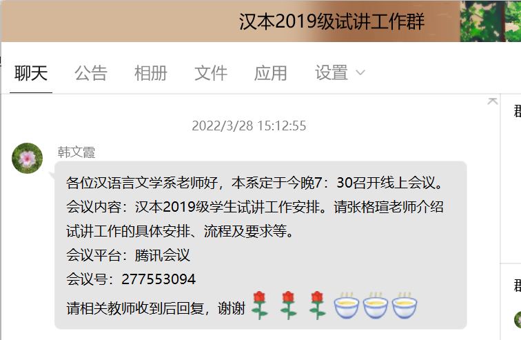 3月28日晚7点半,汉语言文学系召开“汉语言文学2019级试讲工作线上说明会”。张格瑄就试讲内容、说课及讲课要求、试讲时间、指导分配等情况做了详细说明,全体指导教师围绕试讲工作指导环节、标准要求等进行了讨论。