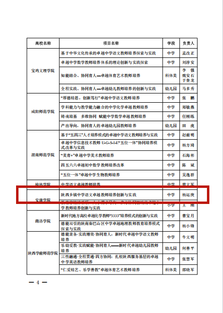 近日,陕西省教育厅发布《陕西省教育厅办公室关于公布首批省级卓越教师培养计划改革试点项目的通知》,公司杨运庚教授主持申报的“陕西乡镇中学语文卓越教师培养创新与实践”成功获批立项,标志着公司汉语言文学师范教育又取得一项重要成果。